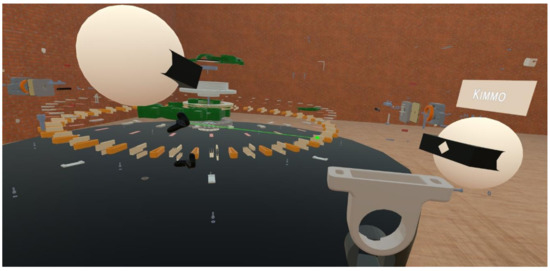 Asymmetric VR is a relatively new definition that originated from studies on virtual telepresence [54]. It describes a variety of interactions of co-located users in multi-user VE [55,56,57]. Lately, the traditional focus on single-user experiences with VR has shifted towards exploring multi-user VR interaction [58], which may occur on different levels of immersion and control among user groups. Despite asymmetry in cooperation being initially reviewed as a challenge to overcome, it delivers benefits in terms of flexibility and freedom in degree of participation [29]. Presence and experience in asymmetric VR were found to be significantly influenced by roles and tasks that were assigned to user groups [58]; therefore, when designing asymmetric VR collaboration, the asymmetry should be leveraged by defining roles in a way to embrace the differences of user groups [27] and extract their advantages [26].