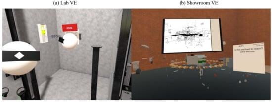 Working virtual environments: (a) the Lab VE, which replicates a real elevator shaft and (b) the Showroom VE with a disassembled 3D CAD model.