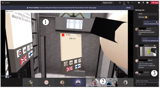 Screenshots from the test procedure: (1) streamed VR image from the VR-participant’s point-of-view, (2) streamed video of the VR-participants, (3) Teams chat activity.