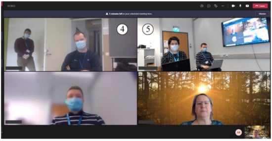 The semi-structured group interview was conducted at the end of the study by the main facilitator to raise discussion on the usability of the system, the asymmetry between VR and Teams and related collaboration practices; the participants were asked to turn on their cameras during the interview (Figure 6). The interview script consisted of five sections, covering (1) general UX, (2) VR system’s usefulness and efficiency for industrial tasks, (3) experiences of asymmetric use between VR and Teams, (4) roles and tasks in asymmetric collaboration, and (5) improvements for the COVE-VR platform and asymmetric collaboration practices. Additionally, observation forms with pre-defined questions were used to collect observation-based data systematically.