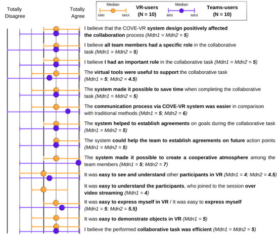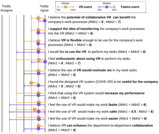 The digitally hybrid collaboration approach with the COVE-VR was found to be beneficial by both participant groups, whereas virtual working spaces and interaction with virtual prototypes were seen as a way “to improve the communication and have high-efficient meetings” (T1). The results of the survey on the subjective perception of VR technology are shown in Figure 7, that visualizes the minimum, maximum and median of survey answers in two groups: orange for VR-participants and violet for Teams-participants. The figure demonstrates the main trends of perception and minor differences between the two groups, by showing the division of answers over a 7-point scale, together with the middle value of answers. The results revealed that all industrial experts agreed or strongly agreed that the potential of collaborative VR can benefit the company’s working processes and supported the idea of transferring their working processes into VR. In general, the figure shows that VR was evaluated as a technology to advance industrial working processes by a majority: only one VR-participant and two Teams-participants left negative responses to several statements. On the opposite side, all experts believed that VR can enhance department-to-department collaboration. Further, 95% of the experts found VR to be flexible for the company’s work processes, felt enthusiastic to use VR to perform their work tasks and believed that the use of VR would increase their motivation. 90% would like to use VR at work and agreed that VR would increase their performance. Finally, when counting the percentage of agreements for the statements, the use of VR was found to make their work easier by 85%, safer by 75%, and faster by 70%.