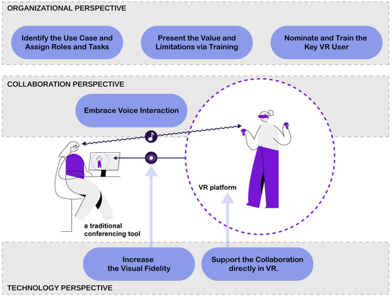The guidelines are supported by Figure 10, which visualizes the nature of asymmetry between VR platform and traditional conferencing tools and further determines the perspective from which the guidelines should be approached: organization, collaboration and technology perspectives.