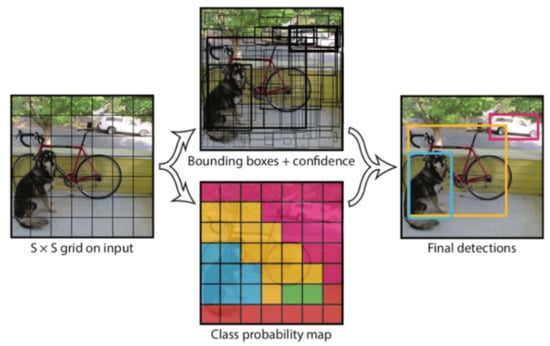 Figure 3 shows the processing process of YOLO. First, the input image is divided into an S X S grid area. In each grid area, the bounding box is predicted as many as the number of Bs corresponding to the area where there is an object. This is represented by (x, y, w, h), where (x, y) is the center point coordinate of the bounding box, and w, h are the width and height of the bounding box.