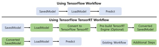 Figure 6 shows a comparison of the inference workflow of the basic TensorFlow and TRT. TensorFlow workflow typically loads the saved model and executes inference using TensorFlow runtime. For TF-TRT, TRT optimization is applied to the model’s TRT support subgraph. Optionally, several additional steps are included, including pre-building the TRT engine. The precision mode is used to represent the mixing precision (e.g., float32, float16) that can be used to implement TF-TRT operations. Then, in the saved model, a convert object is created to obtain transformation parameters and inputs. In TensorFlow 2.0, TF-TRT only supports models stored in the TensorFlow SavedModel format. Next, when the converter convert() method is called, TF-TRT converts the graph by replacing the TRT-compatible part of the graph with TRT EngineOps. The TRT execution engine must be built on a GPU of the same device type as the device type on which the inference will be run, because the build process is GPU-specific. For example, if you generate TF-TRT based on the T194 GPU used by Jetson AGX Xavier, it will not work with T4 GPU of other Jetson equipment [31].