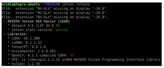 For the deep learning framework comparative analysis, AGX Xavier 16 GB, sold by Nvidia, was used. The OS is installed through SDK Manager provided by Ubuntu-based Nvidia, and version 32.6.1 is applied. To install CUDA, cuDnn, and TRT, install the Jetpack package version 4.6 to complete the deep learning-related library environment setup. [35]. The library version installed through the Jetpack package is shown in Figure 7.