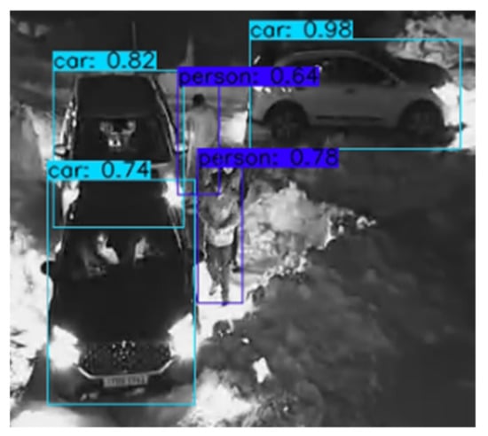 The video used to measure inference performance has a resolution of 1280 × 720 at 30 FPS and is 30 s long. The video is a night image of a low-light environment, two to three people are detected, and three cars are detected fixedly. For readers who are curious about the image of the sample video used, the screen captured during inference performance measurement is shown in Figure 8.