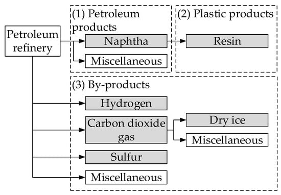 In process (1) in Figure 1, petroleum products include naphtha, gasoline, jet fuel oil, kerosene, light oil, heavy oil, kerosene, asphalt, grease, paraffin, LPG, and LNG. Among these petroleum products, naphtha was selected because it is consumed as a product without being used as fuel, and it has the shortest life cycle until it becomes waste. In process (3) shown in Figure 1, hydrogen, carbon dioxide gas, and sulfur were selected because they were shipped. Hydrogen is a by-product of the catalytic reforming process. All the hydrogen generated by catalytic reforming is self-consumed to remove sulfur and nitrogen from petroleum products. However, because this alone is insufficient in terms of the amount of hydrogen produced, additional hydrogen is produced in hydrogen plants adjacent to petroleum refinery plants. Carbon dioxide gas is a by-product of petroleum refining. In this study, we focused on dry ice. One reason is that demand is rapidly increasing due to the transportation of the COVID-19 vaccine, while the shortage of raw materials is becoming more serious in Japan []. Sulfur is obtained through desulfurization during petroleum refining and used as a raw material for fertilizers and chemicals.