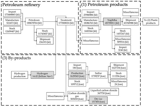 A material flow, focusing on the processes related to petroleum refining shown in Figure 1, was created to understand the trend of petroleum consumption in Japan. The material flow was created in 2019, when the latest materials related to the supply chain were available. In the material flow, the following three processes were focused on: (1) naphtha as petroleum products; (2) plastic products; and (3) hydrogen, carbon dioxide, and sulfur as petroleum by-products.