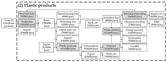 Data relating to the processing of petroleum products in process (1) shown in Figure 1 apply statistical data published by the Japan Agency for Natural Resources and Energy []. The data utilized were production, shipment, import, export, and stock. Data relating to the processing of plastic products process (2) shown in Figure 1 apply statistical data published by the Japan Plastic Waste Management Institute []. The utilized data were resin manufacture, plastic product manufacture and consumption, waste disposal, and recycling. Considering the data relating to by-product process (3) shown in Figure 1, there were no statistical data on hydrogen and carbon dioxide gas. Hydrogen production was applied to the survey results (14.02 billion Nm3) of Mizuho Research & Technologies Ltd (Mizuho Research & Technologies Ltd, Tokyo, and Japan.) []. The annual domestic demand for dry ice is approximately 350.00 thousand ton, of which approximately 25.00 thousand ton is imported []. Hence, a difference of 325.00 thousand ton was set as the domestic dry ice production. The Japan Industrial and Medical Gases Association [] states that 48.8% of domestic liquefied carbon dioxide production is derived from petroleum-refining plants. Therefore, this study assumed that the ratio of dry ice production from an oil refinery plant is equivalent to the production of liquefied carbon dioxide, which is estimated to be 157.30 thousand ton. Data relating to sulfur apply statistical data published by the Japan Ministry of Economy, Trade and Industry []. The data utilized concern sulfur production.