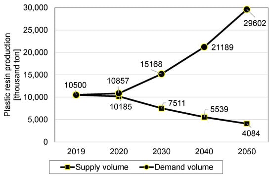 The global plastics market is growing steadily, with an annual growth rate of 3.81% for the projected period 2016–2026 []. The demand for dry ice is expected to increase further, with the expansion of the food delivery market and for transportation of pharmaceuticals such as the COVID-19 vaccine. Japan currently has an output gap for dry ice, and this gap is expected to widen if the national government does not take measures. Figure 5 shows outlook of supply and demand volume of dry ice production. The figures in Table 2 were used for the supply transition. Trends in demand were estimated assuming that the annual growth rate (3.81%) indicated above would continue until 2050. Domestic dry ice production derived from petroleum by-products was approximately 157.00 thousand ton in 2019 and is expected to decrease to approximately 61.00 thousand ton in 2050. If the demand volume is changed at the aforementioned annual growth rate, approximately 237.00 thousand ton of resin production from petroleum refineries is expected to be required by 2030. In 2050, 501.00 thousand ton is expected to be needed.