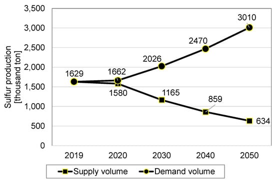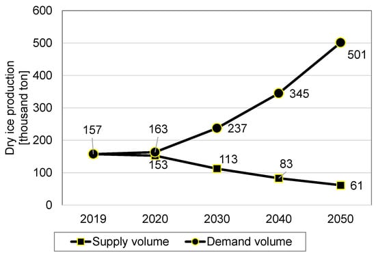 Sulfur is also a raw material for fertilizers such as hydrogen, and its demand is expected to increase []. Figure 6 shows the outlook of the supply and demand volume of dry ice production. The figures in Table 2 were used for the supply transition. Trends in demand were estimated assuming that the annual growth rate (2.0%) indicated above would continue until 2050. Domestic sulfur production was approximately 1629.00 thousand ton in 2019 and is expected to decrease to approximately 634.00 thousand ton in 2050. If the demand volume is changed at the aforementioned annual growth rate, approximately 2026.00 thousand ton of resin production from petroleum refineries is expected to be required by 2030. In 2050, 3010.00 thousand ton is expected to be needed. Domestic sulfur production is derived entirely from desulfurization during petroleum refining []. Therefore, a decrease in sulfur production as a petroleum by-product directly leads to a decrease in domestic sulfur production.