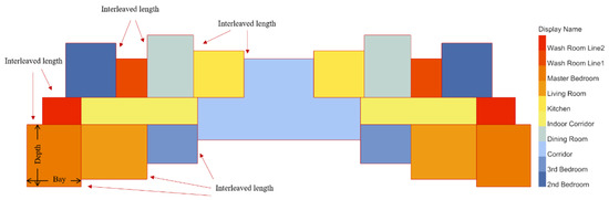 In this study, the thresholds of room bays, depths (Table 1), and the laws of arrangement of each functional space (Figure 3) were summarized from several sets of house types, which were based on the prototype of prefabricated high-rise (one-staircase, two-family) commercial houses with a PC frame shear wall structure in Tianjin. After this, random values in the parameter range were used to form the base floor plan.