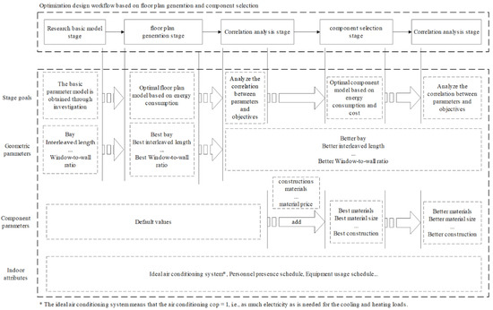 Therefore, this paper proposes two design methods based on the genetic algorithm to take building energy consumption into consideration: a floor plan generation method for the conceptual design process and a complement selection method for the preliminary design. The designer can then use the results of the optimization and parameter correlation analysis as a theoretical basis to make further modifications to the computer-aided optimization design. The total workflow of the two design methods is shown in Figure 1.