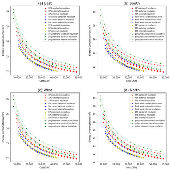 The energy-cost charts for the four orientations show the same pattern. Rock wool board material and polystyrene board material were closer to the 0-coordinate point of the coordinate system—i.e., they were better than the other insulation materials in terms of their reducing energy consumption and cost. Considering the cost of fire protection, rock wool board was selected as the optimal material in the next dual-objective optimization. From Figure 6, it can be seen that the two innermost curves are for sandwich insulation, which indicates that the effect of sandwich insulation is better than that of external insulation and internal insulation. Thus, sandwich insulation was chosen as the construction method for the optimization determination.