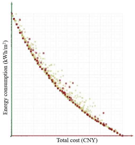 The thickness was selected as the optimization object, and basic convergence was achieved after 10 iterations. The Pareto frontier solution set (Figure 7) was derived after reaching the maximum number of iterations, and correlation plots between insulation thickness, total energy consumption, and total cost for each orientation were derived (Figure 8).