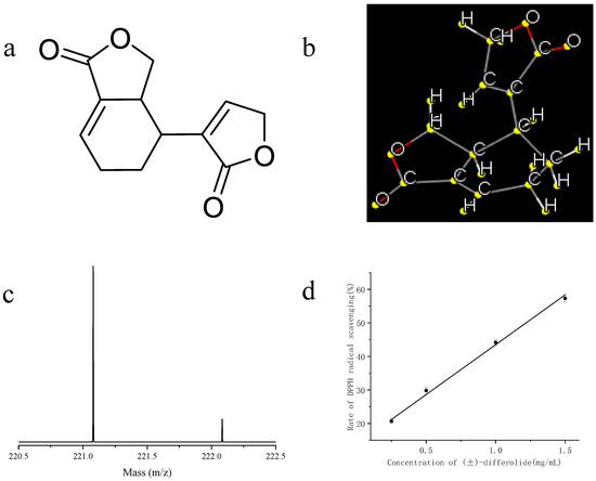 The structure and DPPH radical scavenging assay of (±)-differolide. (a): Structure of (±)-differolide; (b): X-ray crystal diffraction of (±)-differolide; (c): The m/z of (±)-differolide; (d): The rate of DPPH radical scavenging of (±)-differolide (in triplicate).