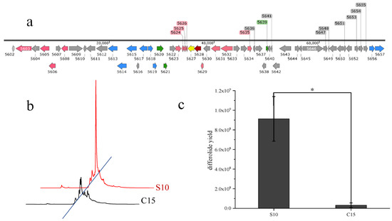 Biosynthesis of (±)-differolide. (a): The biosynthesis gene cluster of (±)-differolide (The function of genes was distinguished with a different color. Red: core biosynthetic genes; pink: additional biosynthetic genes; blue: transport-related genes; green: regulatory genes; grey: other genes; yellow: gene 5627, which was knocked out). (b): The TIC spectrum of HR-LC-HS between ΔC15 and WT. (c): The yield of (±)-differolide difference between ΔC15 and WT (*: The result of significant test showed the R2 < 0.05).