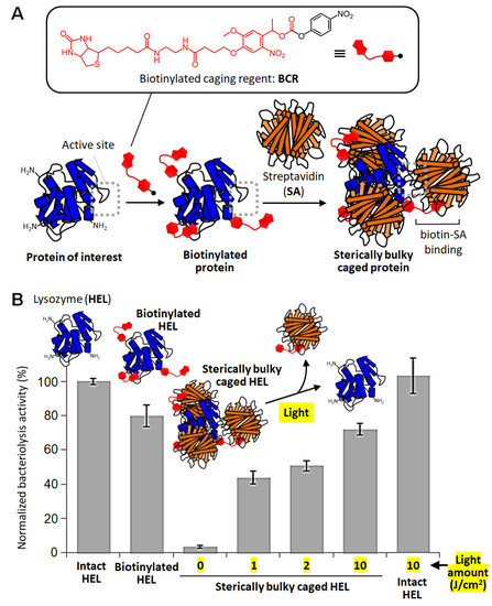 - Takamori, S.; Yamaguchi, S.; Ohashi, N.; Nagamune, T. Sterically bulky caging for light- inducible protein activation. Chem. Commun. 2013, 49, 3013–3015. [Google Scholar] [CrossRef] [PubMed]