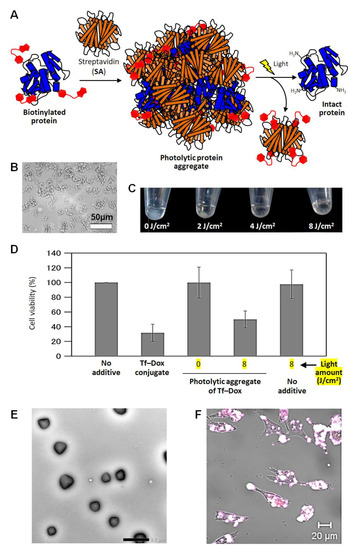 - Ishiwatari, A.; Yamaguchi, S.; Takamori, S.; Yamahira, S.; Minamihata, K.; Nagamune, T. Photolytic protein aggregates: Versatile materials for controlled release of active proteins. Adv. Health Mater. 2016, 5, 1002–1007. [Google Scholar] [CrossRef] [PubMed]