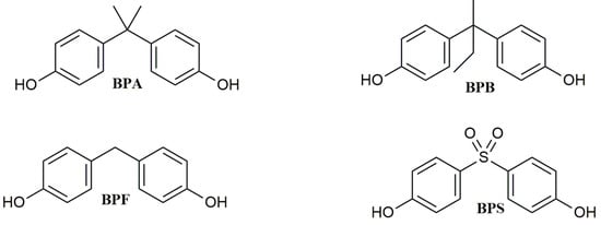 Bisphenol A (BPA, Figure 1) is a synthetic chemical with a long history of use. Since 1950, it has been utilized to produce epoxy resins, and it has also been widely applied in the plastic industry as a monomer to synthesize polycarbonate polymers or as an additive in the synthesis of other kinds of plastics, such as polyvinyl chloride (PVC) [1]. BPA is mainly used in manufacturing Food Contact Materials (FCMs), such as storage containers, plastic water bottles, food packaging, and the inner coatings of food cans [2], but it is also contained in electronics equipment, children’s toys, dental sealants, thermal paper, and flame retardants.