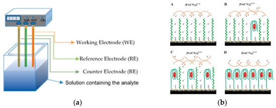(a). Schematic representation of a three-electrode cell. The difference in potential is measured between the working electrode (WE, orange bar) and the reference electrode (RE, light green). The current is equal in absolute value but of opposite in sign between the WE and the counter electrode (CE, green). Compared to a two-electrode cell, in a three-electrode cell the current and the potential are decoupled, led to a more accurate measurement of these cell parameters. (b). The sensing mechanism using the Zhou et al. WE. In absence of BPA, the aptamers are unfolded and the exchange of electrons between the WE and the ferrycianide probe is allowed. After the formation of BPA-aptamer complexes the exchange of the electrons with the probe was umpaired, resulting in a decrease of the peak current. [Reprinted from J. Food Chem., 162, Zhou, L.; Wang, J.; Li, D.; Li, Y. An electrochemical aptasensor based on gold nanoparticles dotted graphene modified glassy carbon electrode for label-free detection of bisphenol A in milk samples. 34–40. Copyright 2014, with permission from Elsevier].
