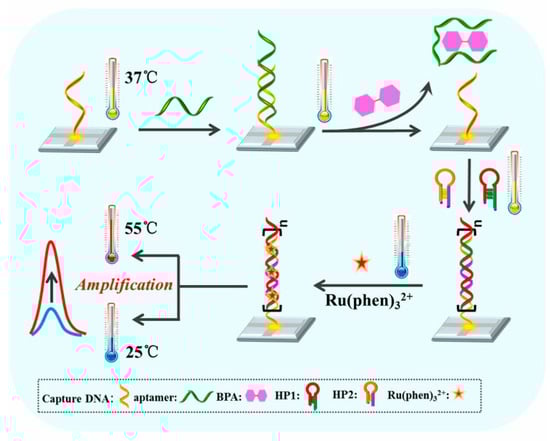 Zhang et al. [73] used hybridization chain reaction (HCR) technology to realize the binding site of the electrochemiluminescent [Ru(phen)3]2+ on the indium-tin-oxide (ITO) working electrode (Figure 7). In particular, cDNA was coated on the surface of the electrode and then hybridized with BPA aptamer to form dsDNA. In the presence of BPA, the aptamer was released, and the free cDNA triggered the formation of long dsDNA by HCR. Therefore, [Ru(phen)3]2+ could intercalate the long dsDNA, causing an enhancement of the electrochemical signal.