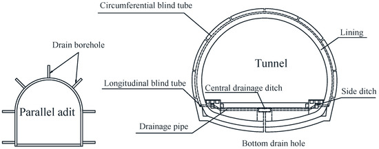 The collaborative drainage system consists of a tunnel blind pipe network and parallel adit drain borehole. The tunnel is drained through the blind pipe network, and the parallel adit is drained using the drain boreholes (Figure 1).