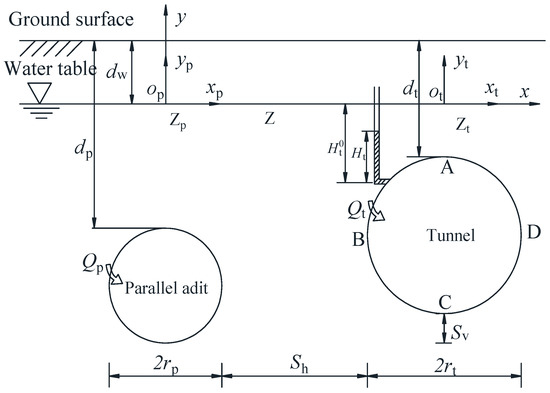 where cp = dp + rp − dw, ct = dt + rt − dw, l = rt + rp + Sh; np and nt are the radial direction of the circumference of the parallel adit and the tunnel, respectively (the outer normal is positive); K is rock permeability coefficient; and ip and it are the radial hydraulic gradient of the parallel adit and tunnel circumference, respectively.