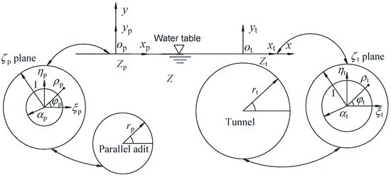 The water table and tunnel (or parallel adit) circumferences in the Zj plane are conformally mapped to two circles with radius 1 and αj in the ζj plane by mapping functions (where j = p, t; p represents the parallel adit, and t represents the tunnel. For convenience, follow-up discussions also follow this agreement) (Figure 3) [14]. The mapping function is: