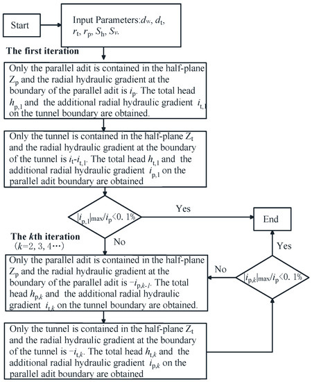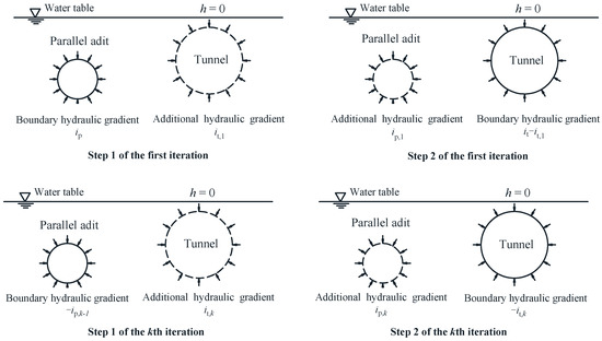 Step 2 of the kth iteration: Considering that the hydraulic gradient at the boundary of the tunnel is −it,k, and only the tunnel is contained in the Zt plane, the total head ht,k can be obtained. The additional radial hydraulic gradient ip,k at the parallel adit boundary can then be determined using ht,k. The boundary conditions for the iteration steps are shown in Figure 5. After each iteration, Equation (11) is used to determine if the iteration continues.
