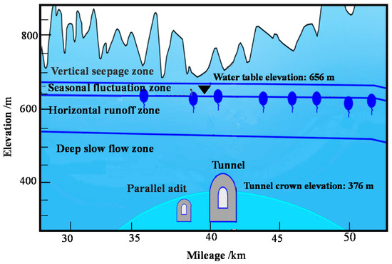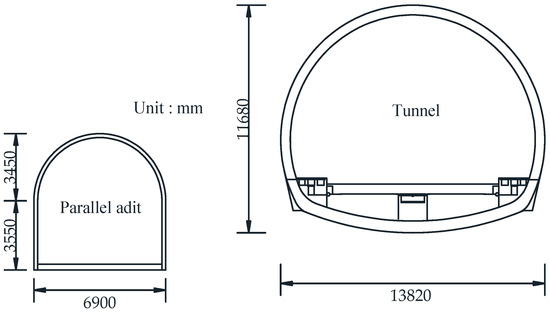 The Jiajiaoshan Tunnel (Chongqing, China) proposed for the China Chengdawan high-speed railway passes through the deep slow flow zone of soluble rock (Figure 6). The permeability coefficient of the surrounding rock in the water-rich high-pressure section is 1.0 × 10−6–9.0 × 10−6 m/s. The predicted maximum water pressure is 3 MPa and the maximum water inflow is 32.5 × 104 m3/d. A parallel adit is proposed to assist the construction of the tunnel and drain during operation to reduce the water pressure on the tunnel lining. The cross-sectional dimensions of the tunnel and parallel adit are shown in Figure 7. According to the equal permeable area principle (equal circumference of the outer profile of the section), the Jiajiaoshan Tunnel and the proposed parallel adit are equivalent to two circular sections with radii of 6.9 m and 3.9 m, respectively. The crown position of the tunnel remains unchanged in the equivalent process. Buried depth of tunnel and water table and position parameters of parallel adit relative to the tunnel are shown in Table 1.