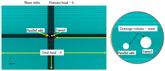 The following calculations are based on the parameters of the Jiajiaoshan Tunnel (Table 1). In order to verify the accuracy of the semi-analytical results, a finite element model is established using ABAQUS (2020) software. The basic assumptions and calculation parameters of the numerical model are consistent with the analytical model. The boundary conditions of the numerical model are set as follows: The total head at the bottom and both sides of the model is 0. The upper part of the model boundary is the water table, and the pressre head is 0. The drainage volume is set at the boundary both the tunnel and parallel adit. The numerical model is 9600 m wide and 2000 m high to simulate a semi-infinite domain with a deeply buried tunnel and a parallel adit (Figure 8).