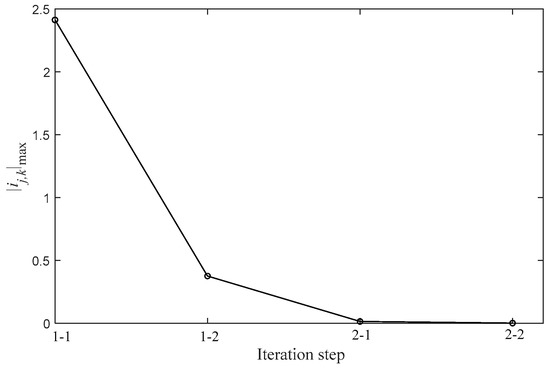 Figure 9 shows the variation of the maximum additional hydraulic gradient |ij,k|max at the parallel adit and tunnel boundary during the iteration. Horizontal coordinates represent the iterative steps, i.e., 1-1 represents the first step of the first iteration, 1-2 represents the second step of the first iteration. The additional radial hydraulic gradient decreases quickly, indicating that the analytical algorithm has a fast convergence speed. After two iterations, |ip,1|max/ip = 0.00796%. Termination condition (11) is met, and the iteration ends. Theoretical calculations show that the convergence rate is related to the relative positions of the parallel adit and tunnel, burial depth, and drainage volume.