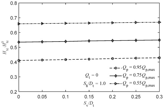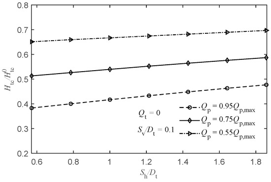 Figure 11 illustrates the relationship between the pressure head of the tunnel crown and horizontal distance Sh with different parallel adit discharges. The ordinate represents the relative pressure head at the crown of the tunnel (Htc is the pressure head of the tunnel crown when the collaborative drainage system works, and is the pressure head at the crown when the tunnel and parallel adit are all fully waterproofed). The horizontal distance Sh is linearly positively correlated with the tunnel crown pressure head. For the three different parallel adit drainage conditions (Qp = 0.95 Qp,max, Qp = 0.75 Qp,max, Qp = 0.55 Qp,max), Sh changes from 1.9 Dt to 0.6 Dt, and the relative pressure head decreases from 0.47, 0.59, 0.70 to 0.38, 0.51, 0.64, respectively. The pressure head on the lining can be reduced to a certain extent by reducing Sh; however, considering the construction conditions and surrounding rock stability, the distance between the parallel adit and tunnel should be no less than the tunnel diameter.