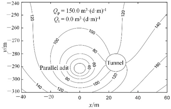 - The theoretical model and semi-analytical algorithm of the collaborative drainage scheme for a tunnel and parallel adit proposed here can accurately meet the preset drainage boundary conditions in several iterations. The calculation results are consistent with the numerical simulation results, which are suitable for the calculation and analysis of drainage schemes.