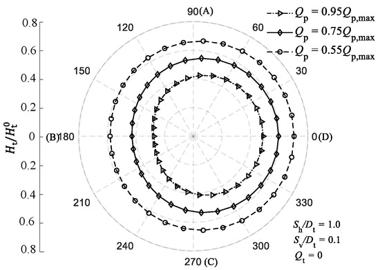 Figure 13 shows the pressure head contour map when drainage primarily relies on the parallel adit. There is a clear pressure drop funnel around the parallel adit, and its influence radiates to the surrounding area, which releases the water pressure around the tunnel. However, the water pressure around the tunnel is unevenly released. In order to accurately evaluate this inhomogeneity, Figure 14 shows the relative pressure head around the tunnel. The water pressure on the side of the tunnel facing the parallel adit is significantly lower than that on the other side. The greater the discharge of the parallel adit, the more significant the heterogeneity. When the parallel adit drainage Qp = 0.95 Qp, the pressure heads of the four points A, B, C, and D at different parts of the tunnel lining are reduced to 0.42, 0.28, 0.40, and 0.49 times of their initial water heads, respectively. Point B has the largest pressure release, which is 1.41 times that of point D, with the smallest pressure release. In addition, the closer to the parallel adit, the greater the density of the contour lines and the greater the pressure gradient, indicating that the distance between the parallel adit and the tunnel decreases, and the inhomogeneity of the water pressure around the tunnel increases (Figure 13).