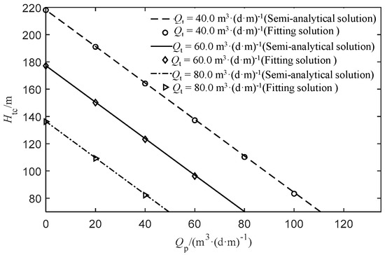 In order to test the accuracy of the fitting formula, a set of parameters were randomly selected in the fitting range (rp = 3.0 m, rt = 7.2 m, dtw = 300 m, Sh = 18 m, Sv = 1.0 m, K = 4 × 10−6 m/s) and calculated. The fitting results are compared with the semi-analytical results (Figure 16). The fitting results are in good agreement with the theoretical calculation results, and their deviations are within 0.8%, showing that the fitting Formula (25) is suitable for the calculation and parameter analysis of the drainage scheme for tunnel and parallel adit.