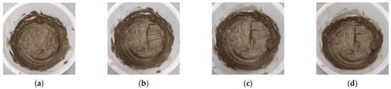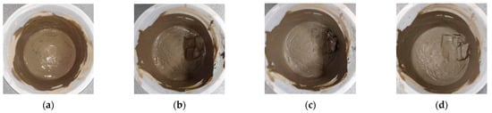 The effect of the RCSLP curing agent was evaluated based on the visible changes and the moisture content. The visible changes of the mud solidified with cement after different curing times are shown in Figure 3, and the visual changes of the mud solidified with the RCSLP curing agent after different curing times are shown in Figure 4.