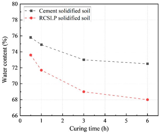 The moisture content of the waste mud was measured by taking samples at 0.5 h, 1 h, 3 h, and 6 h after adding the curing agent. The results are shown in Figure 5. The moisture content of waste mud solidified in the two ways shows relatively small decreases within a short period. The moisture content of cement solidified soil decreased by 3.3%, and that of the RCSLP solidified soil decreased by 5.6%, i.e., the RCSLP curing agent performs better. In general, the moisture content of the waste mud varies in a small range within a short period. Considering the intuitive effect of adding curing agents, the curing effect of the RCSLP curing agent is more significant than that of the cement curing agent.