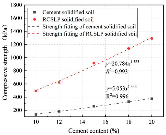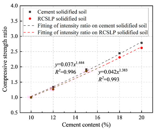 The compressive strength ratio variation of the solidified soil with cement content is shown in Figure 7. The compressive strength ratio of the solidified soil also increases in the form of a power function. The fitting curve correlation coefficient of the strength ratio of cement solidified soil is 0.996, and that of the RCSLP solidified soil is 0.993. Compared with the cement solidified soil, the strength ratio of the RCSLP solidified soil is relatively smaller, and the compressive strength growth rate is also lower. The reason is that the additive has a great effect at the early stage, and the overall strength of the solidified soil can be improved by changing its early strength. With the additive and cement content of 10%, the compressive strength of the RCSLP solidified soil reaches 492 kPa after 7 days. With the increase in the curing time, cement plays an increasingly important role in strengthening the RCSLP solidified soil. When the cement content exceeds 15%, the compressive strength ratio of the cement solidified soil is higher than that of the RCSLP solidified soil. Therefore, the cement content should be 15%.