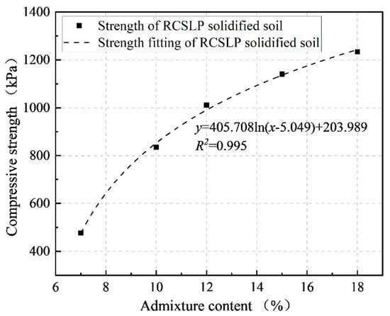 The compressive strength variation of the RCSLP solidified soil with additive content is shown in Figure 8. With the increase in additive content, the compressive strength R3 of the RCSLP solidified soil increases in the form of a logarithmic function, as shown in Figure 8. The relationship between the compressive strength of the RCSLP solidified soil R3 and additive content ωadditive is expressed as Equation (5). The correlation coefficient of the fitting curve is 0.995. When the additive content is 7%, the compressive strength of the RCSLP solidified soil is 477 kPa. When the additive content is 18%, the compressive strength of the RCSLP solidified soil is 1234 kPa, increasing by 2.58 times. Therefore, the additive can significantly improve the compressive strength of the solidified soil. From the economic point of view, the optimal mixing ratio of the additive is 12%.