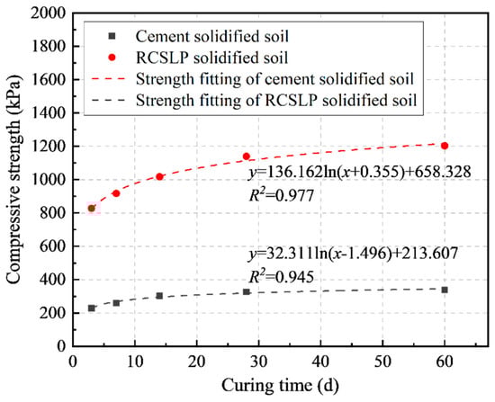 The compressive strength variation of the solidified soil with the curing time is shown in Figure 9. With curing time increasing, the compressive strength of the cement solidified soil and the RCSLP solidified soil increases in the form of a logarithmic function. The fitting relationship between the compressive strength and curing time of the cement solidified soil is expressed in Equation (6), and the fitting relationship between the compressive strength and curing time of the RCSLP solidified soil is shown in Equation (7).