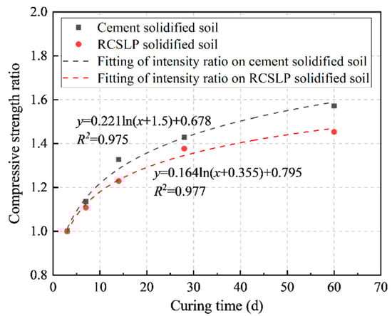 The compressive strength ratio variation of the solidified soil with curing time is shown in Figure 10. As the curing time elapses, the compressive strength ratio of the RCSLP solidified soil is always lower than that of the cement solidified soil, indicating that the compressive strength growth rate of the RCSLP solidified soil is lower than that of the cement solidified soil. The reason is that the additive mainly enhances the early-stage strength of the solidified soil before improving its overall strength. As the curing time increases, the effect of cement on the strength of the solidified soil becomes more important, which is consistent with the results obtained in Figure 9.