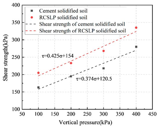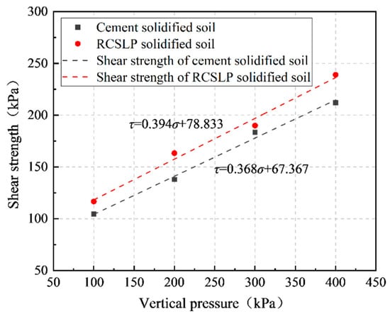 The shear strength of the cement solidified soil and the RCSLP solidified soil after 7 days with vertical pressure is shown in Figure 11. The shear strength of the cement solidified soil and the RCSLP solidified soil after 7 days can be obtained via the following equation: