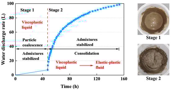 The solidification process of waste mud can be divided into two stages: particle coalescence-solidification and consolidation. As shown in Figure 13, the solidification effect of the waste mud is limited shortly after adding the additive, and the RCSLP solidified soil is still a viscoplastic fluid, which means that the particle coalescence and solidification effect coexist. As time goes by, the hydration becomes more prominent, CaSiO3 and Ca(AlO2)2 contents increase, and the moisture content of the RCSLP solidified soil gradually decreases until the RCSLP solidified soil shifts into an elastic-plastic state.