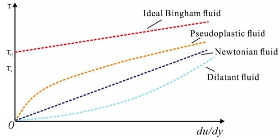 As shown in Figure 14, fluids are mainly divided into Bingham fluid, pseudoplastic fluid, Newtonian fluid, and dilatant fluid []. As a viscoplastic fluid, mud is a typical Bingham fluid but not an ideal one because it has a curve at low shear rates, while the ideal Bingham fluid is straight at low shear rates. The relationship between shear stress τ and shear rate du/dy is as follows: