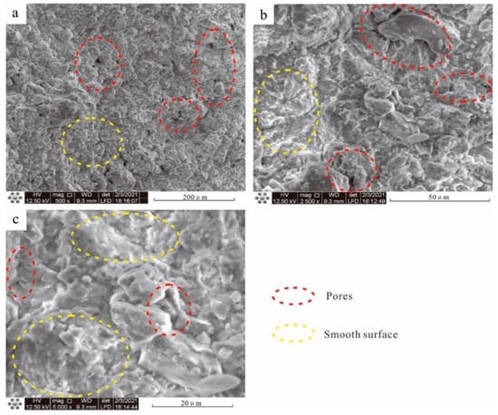 The original waste mud is mainly composed of clay particles and clay flocs, and the skeleton structure surface of the soil particles is smooth in the SEM images (Figure 15). Therefore, the waste mud is more delicate from a macroscopic view. Due to the high content of clay particles, a large amount of free water is absorbed around the clay particles after long-term immersion, resulting in the reduction in the soil strength, which is also the main reason for the difficult waste mud dehydration. Apparent pores are also observed in adjacent soil particles, as well as between soil particles and minerals in the waste mud. The pore diameter is about 5 to 10 μm, most of which are round, long, and irregular (Figure 15a). The pore distribution is not regular (Figure 15b), and the shape and size are different. Therefore, the strength of waste mud is low after natural drying (Figure 15c).