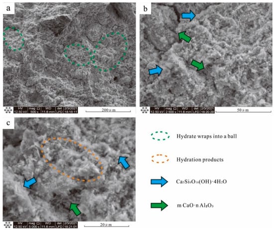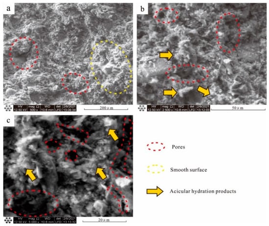 With cement serving as a single curing agent, the spatial structure of the cement solidified soil is improved (Figure 16a), and the pores of the solidified soil are less numerous compared with the original mud. The soil particles are also filled with hydration products (Figure 16b), but their total amount is small. The morphology of soil particles is improved after adding cement, and then some acicular hydration products are generated. However, acicular hydration products cannot fill the larger pores and only develop in the smaller pores (Figure 16c). Therefore, the apparent strength of the solidified soil is still low after adding the cement curing agent.