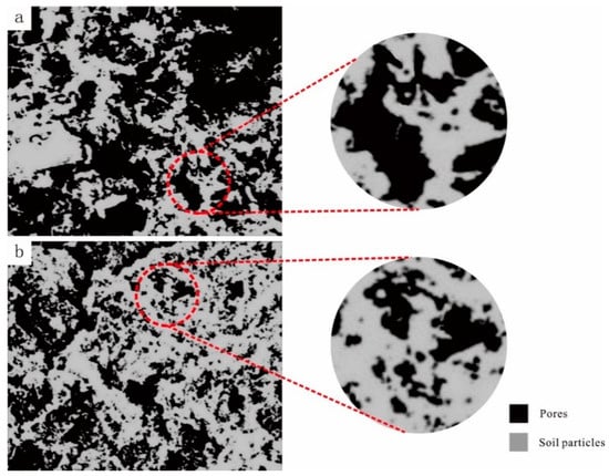 According to the pore classification method of Gao [], the surface porosity and porosity abundance of the solidified soil are statistically analyzed (Figure 19). After using the cement curing agent to solidify waste mud, the pores in the cement solidified soil are mainly macropores, which account for 87.05%, and the other three types of pores are relatively small. However, the pores in the RCSLP solidified soil are mainly medium pores, accounting for 40.45%. In addition, the proportion of large pores and small pores in the RCSLP solidified soil is 37.53% and 12.97%.