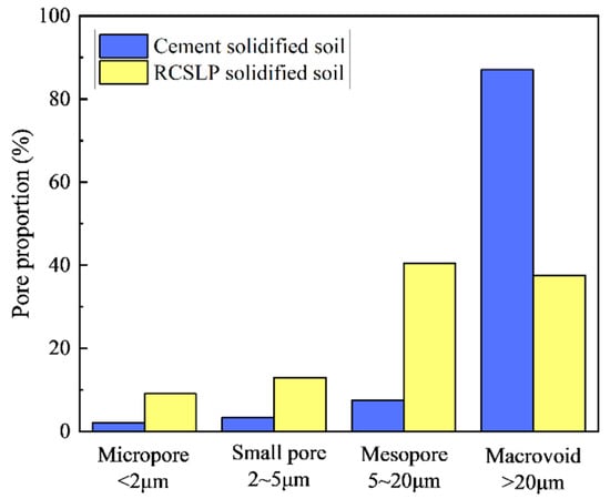 Compared with the cement solidified soil, the proportion of large pores in the RCSLP solidified soil decreases significantly, mainly because the addition of additive greatly promotes the hydration reaction of the cement and produces more hydration products and gel substances to fill the pores, which is consistent with the SEM images. The strength of the RCSLP solidified soil is greatly improved due to the filled pore structure.